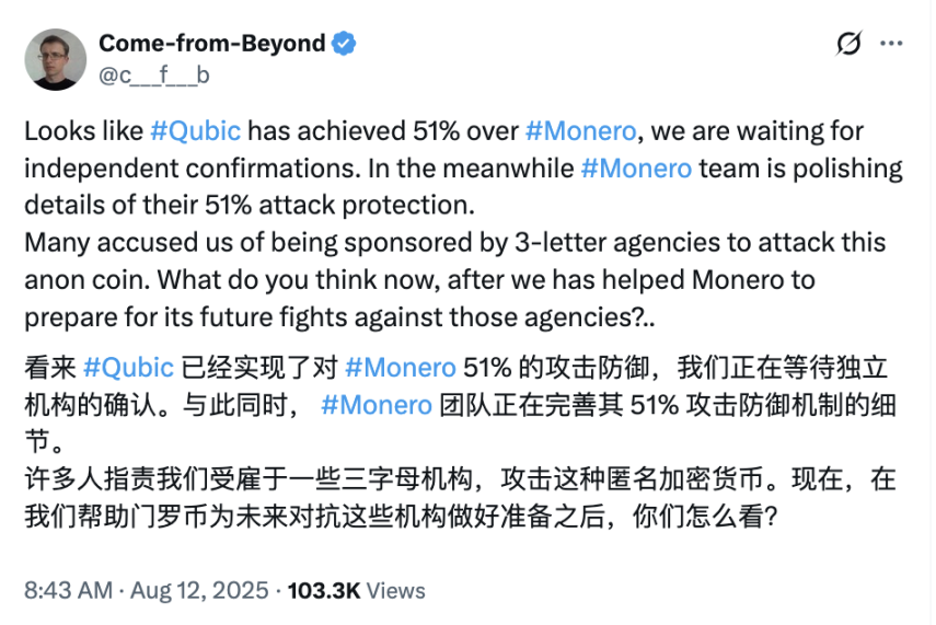 而隐私币领域则上演了一出大戏。Monero 作为隐私币老大哥,遭遇 Qubic 链的算力『劫持』:Qubic 通过更高收益吸引矿工,一度拿走 Monero 超一半算力,并将部分挖矿奖励用于回购自家代币 QUBIC,被不少人视为「变相的经济攻击」。