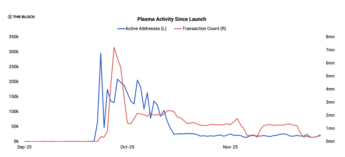 Plasma 在上线不到三个月就挤进了稳定币供应量前八,这类链专注于稳定币的发行、转账和结算,并内置合规工具等高价值功能。尽管后期活跃度有所下降,但其长期发展趋势尚需进一步观察。