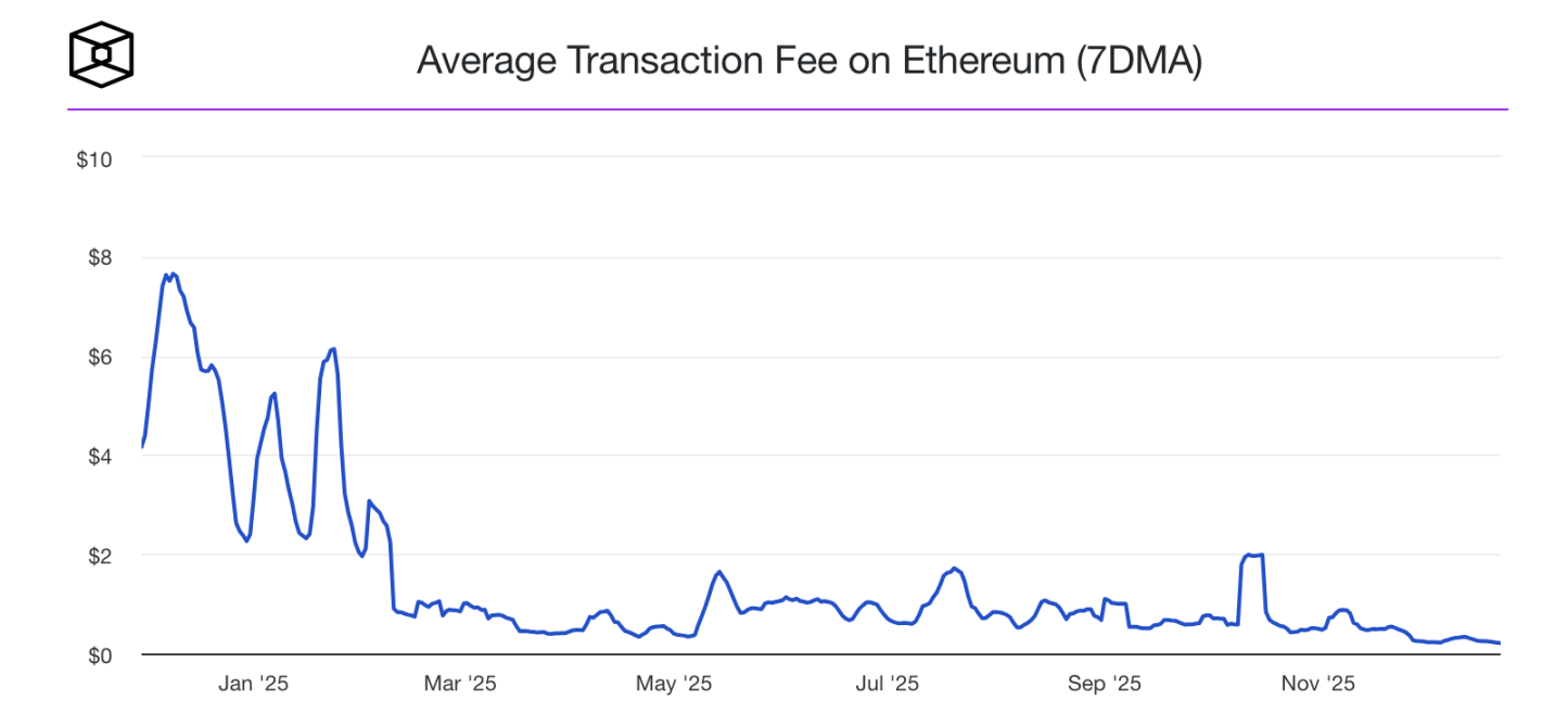 以太坊彻底转型为「结算层」。随着 Pectra 硬分叉的完成,以太坊把日常交易都甩给了 L2,自己专心做「银行的银行」。主网手续费从年初的 7.25 美元跌到 0.19 美元,回到了 2020 年的水平。