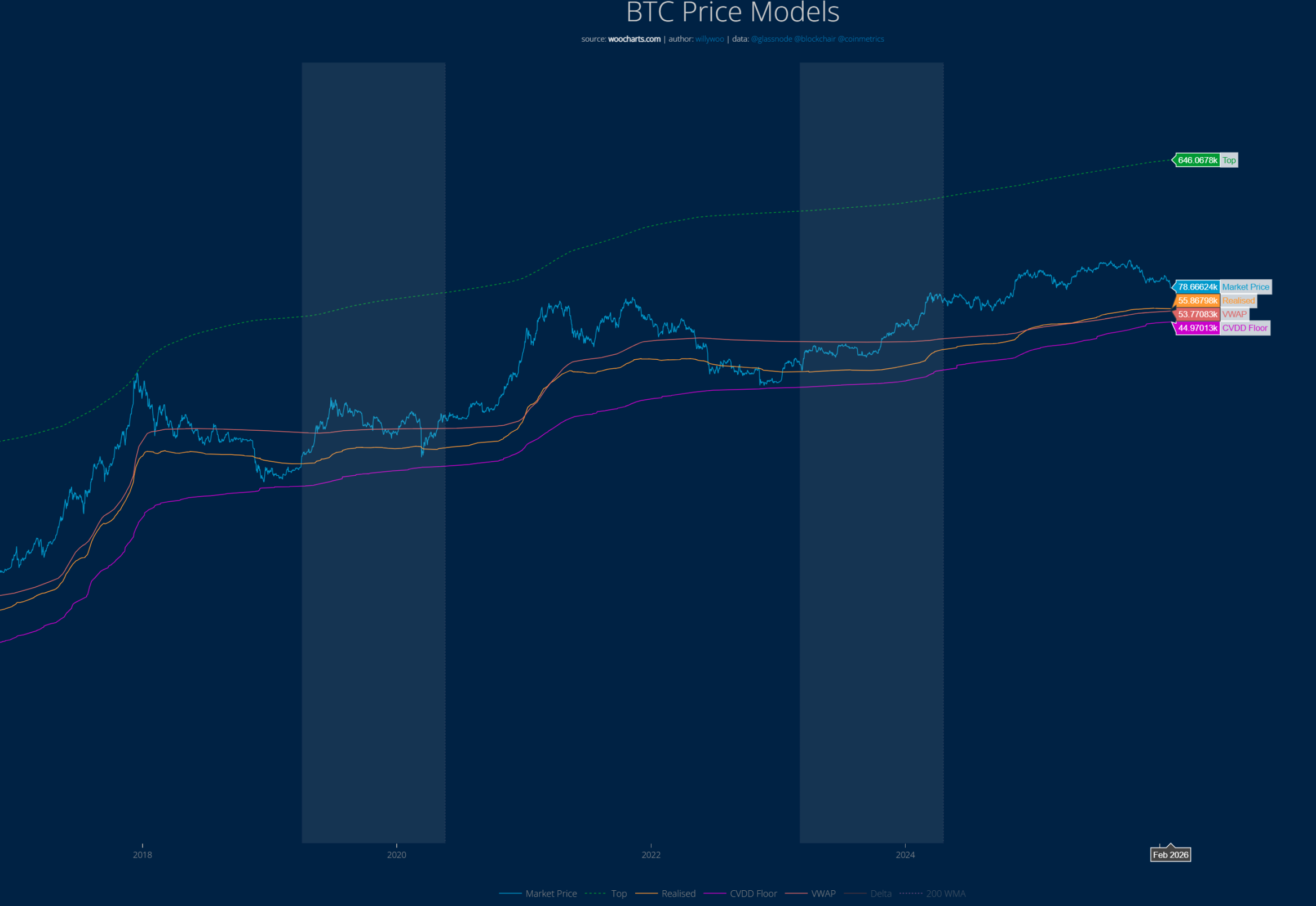 BTC 价格从未跌至红线(CVDD 模型)。目前,CVDD 指标显示其铁底约 4.5 万美元。过往周期中,BTC 一度跌破图中黄线位置,目前该区间范围为 5.3 万至 5.6 万美元。