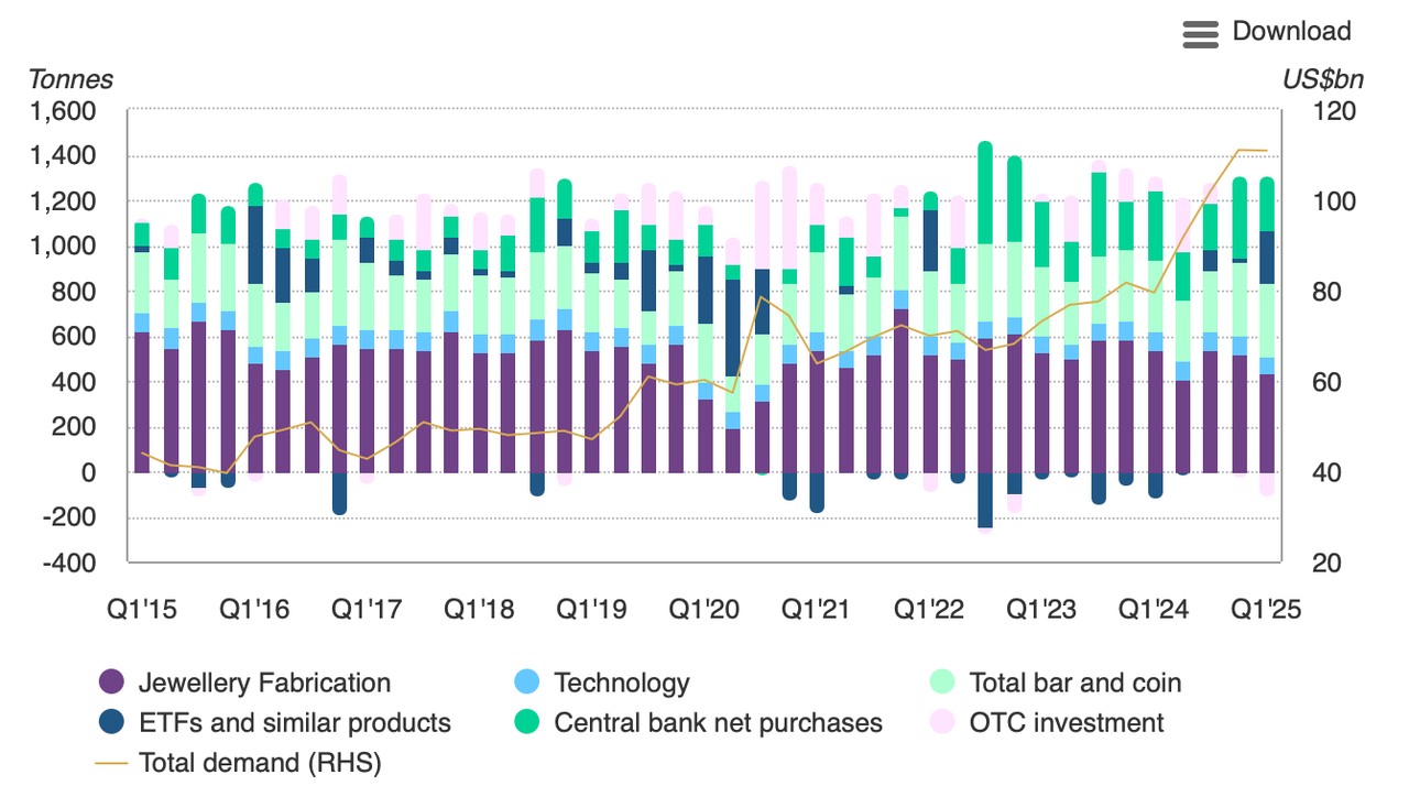 2025 年已接近尾声,各国央行的购金步伐依旧强劲,延续了近年来的趋势。尤其是金砖国家与新兴市场经济体,持续增加黄金储备,进一步强化了黄金的“去美元化”属性。根据世界黄金协会的最新数据,2025 年央行净购买黄金的规模预计将再度逼近历史新高,显示出官方部门对黄金的长期信心。