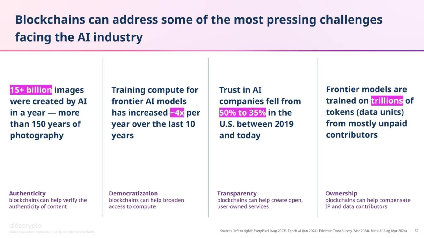 AI 的中心化挑战与区块链网络提供的去中心化机遇形成鲜明对比。加密项目已在尝试解决这些挑战,例如 Gensyn、Story、Near、Starling Labs 等。