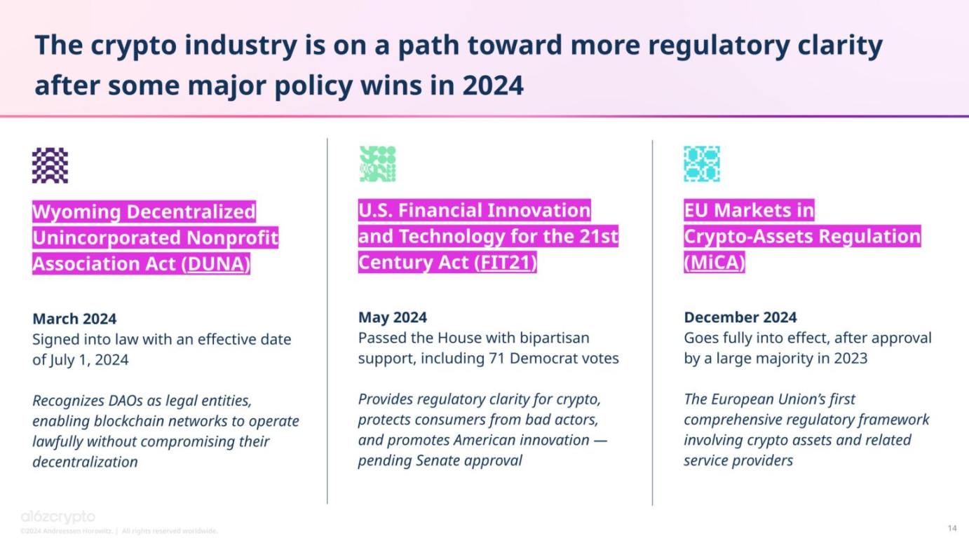 今年加密行业在政策层面也推动了其他重大进展。在联邦层面,众议院以两党支持(208 名共和党人和 71 名民主党人赞成)通过了《21 世纪金融创新与技术法案》。待参议院审议批准后,该法案有望为加密货币创业者提供亟需的监管清晰度。