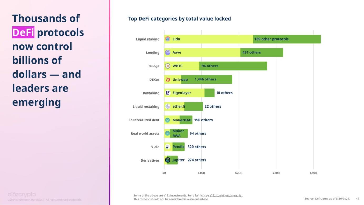 目前有超过 1690 亿美元资产锁定在数千个 DeFi 协议中。顶级 DeFi 子类别包括质押和借贷。