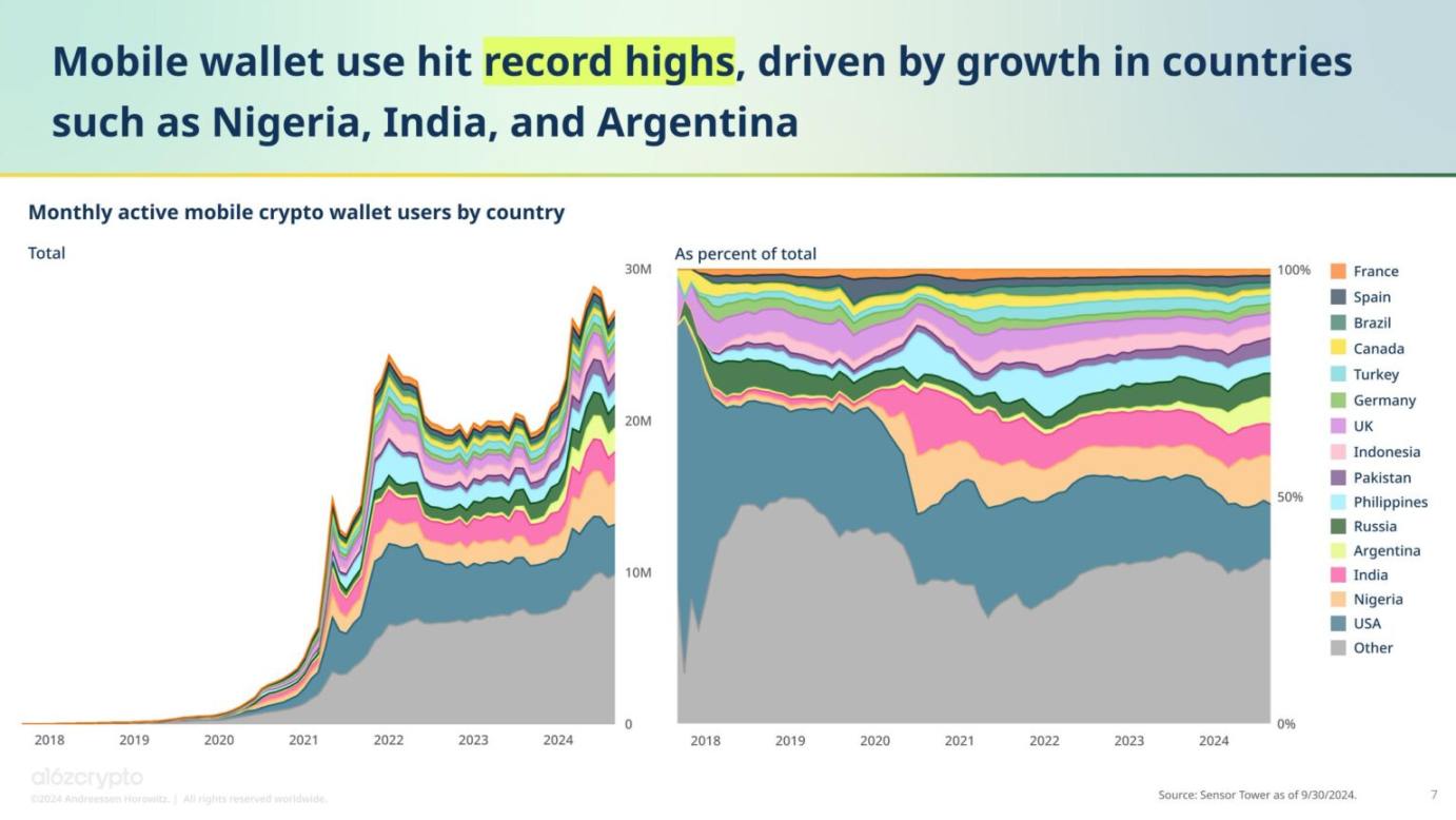 与此同时,月度移动端加密货币钱包用户数于 2024 年 6 月达到 2900 万的历史新高。美国虽以 12% 占比位居月度移动钱包用户之首,但其在总用户中的份额近年来因全球加密货币采用率提升及更多项目通过地理限制排除美国以寻求合规而有所下降。