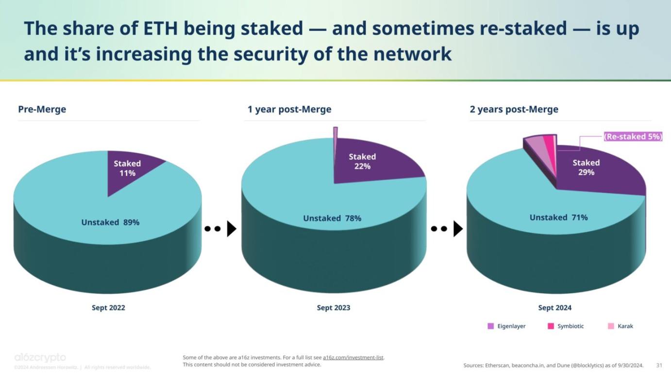 以太坊完成向权益证明过渡已超两年,大幅降低了网络能耗。此后被质押的 ETH 份额从两年前的 11% 升至 29%,极大增强了网络安全性。