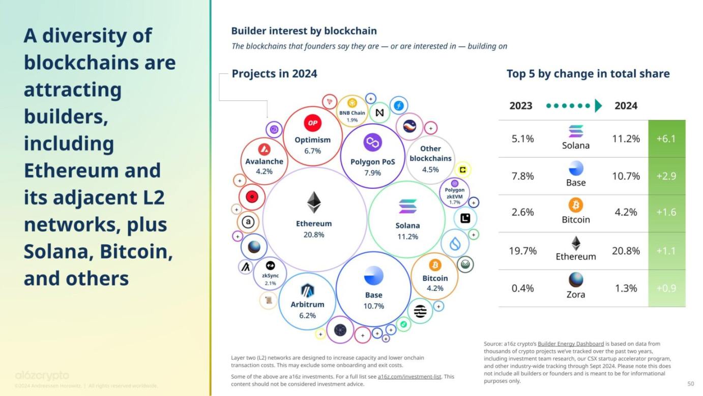 这些趋势也反映在我们的构建者仪表板中。构建者兴趣总份额变化最大的区块链是 Solana。具体而言表示正在或有意在 Solana 上构建的创始人总份额从去年的 5.1% 增至今年的 11.2%。Base 的增幅次之,总份额从去年的 7.8% 增至 10.7%。比特币位列第三,总份额从去年的 2.6% 升至 4.2%。