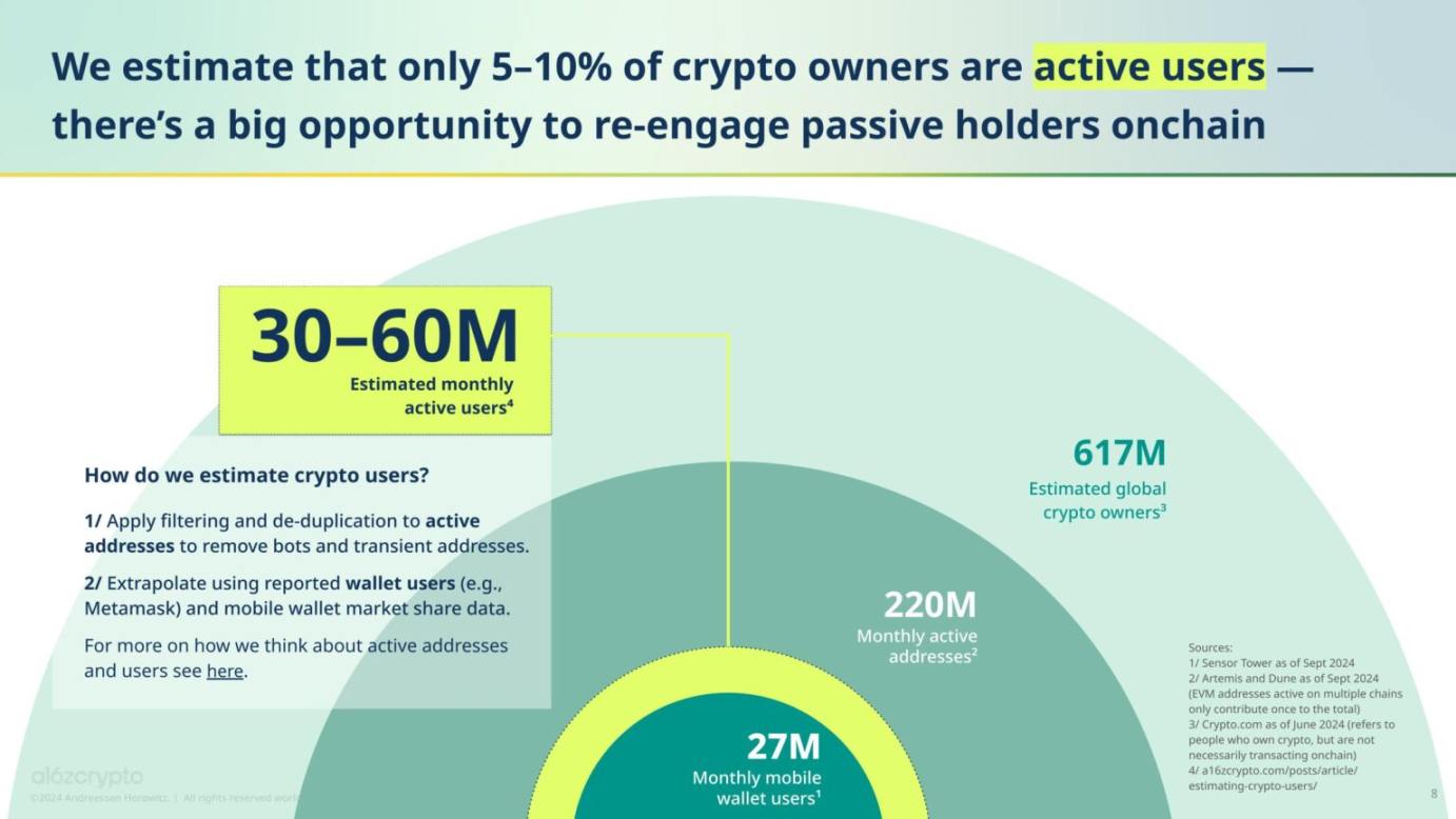 这一差距凸显了吸引和重新激活被动加密货币持有者的巨大机遇。随着基础设施改进使全新、引人入胜的应用和消费者体验成为可能,更多休眠的持有者可能转化为活跃的链上用户。