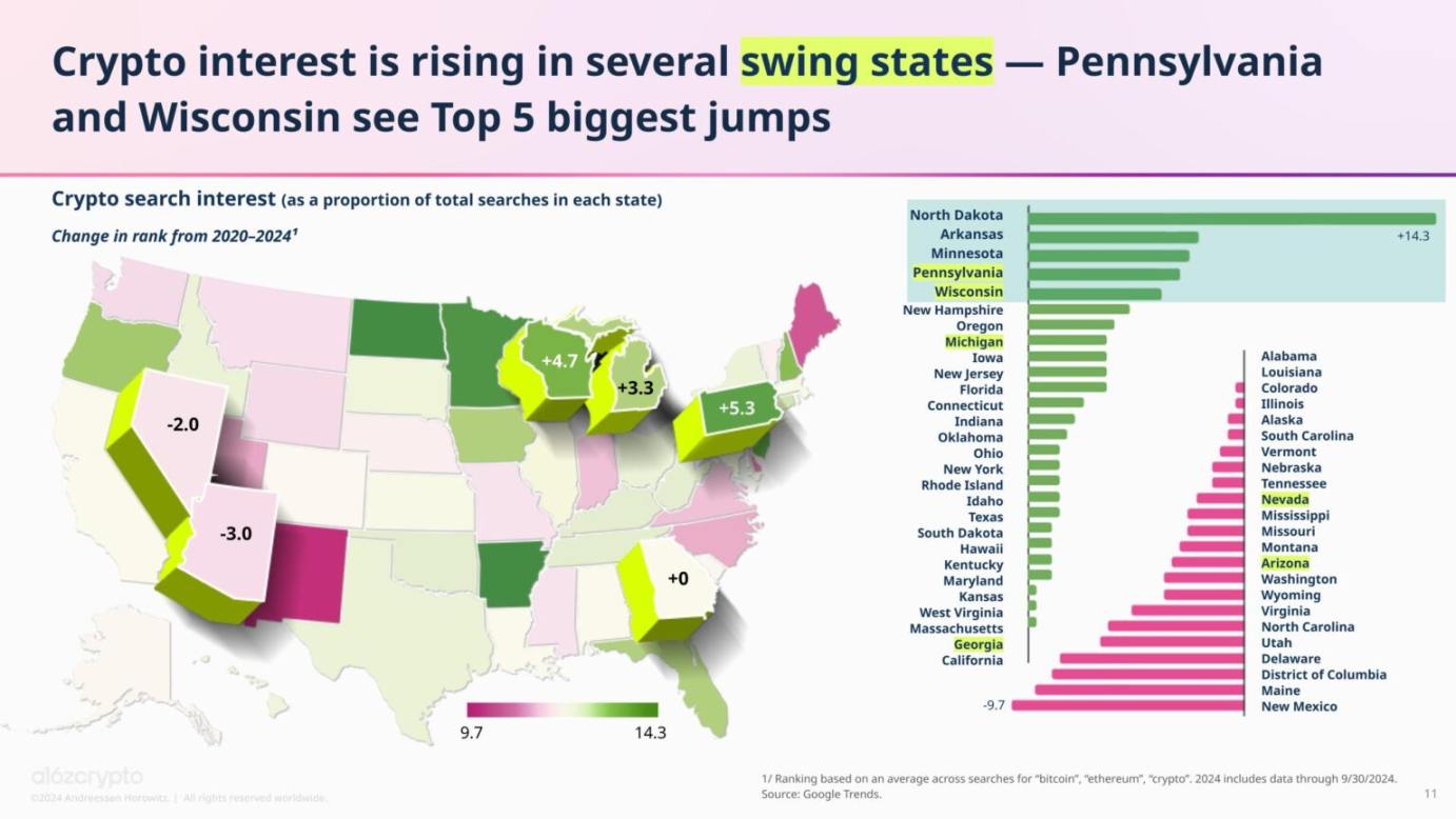 我们测量了摇摆州对加密货币的相对兴趣水平。预计将成为 11 月选情最胶着的两个战场州宾夕法尼亚州和威斯康星州。自 2020 年上届大选以来,加密货币搜索兴趣的增幅(按谷歌趋势搜索总量占比计算)分别位居第四和第五。密歇根州增幅排名第八,佐治亚州保持稳定。而亚利桑那州和内华达州自 2020 年以来的兴趣度则适度下降。