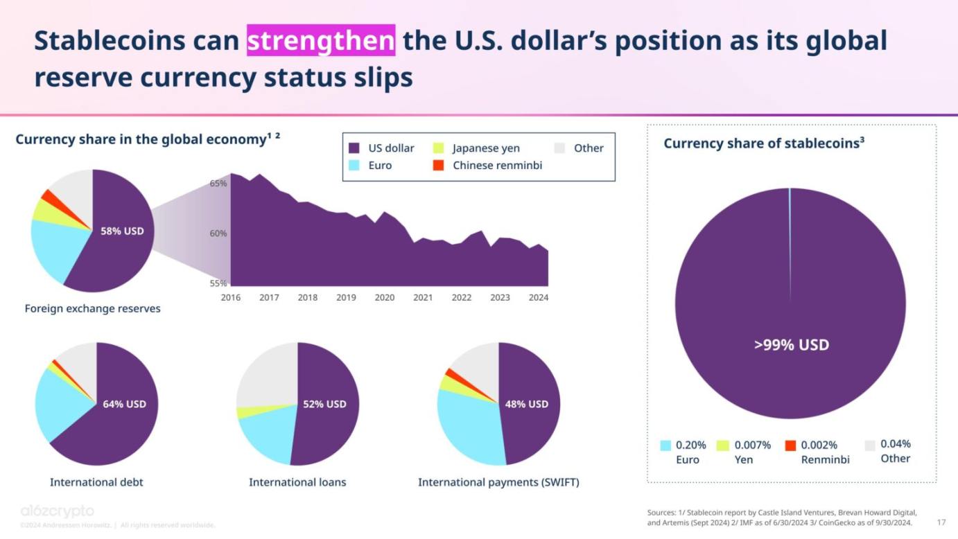 稳定币已成为最受欢迎的加密货币产品之一,也是政策讨论的热点,已有数项相关法案在国会流传。至少在美国,推动因素之一是认识到稳定币可在美元全球储备货币地位下滑之际巩固其国际地位。目前超过 99% 的稳定币以美元计价,远超第二大计价货币欧元(0.20%)。