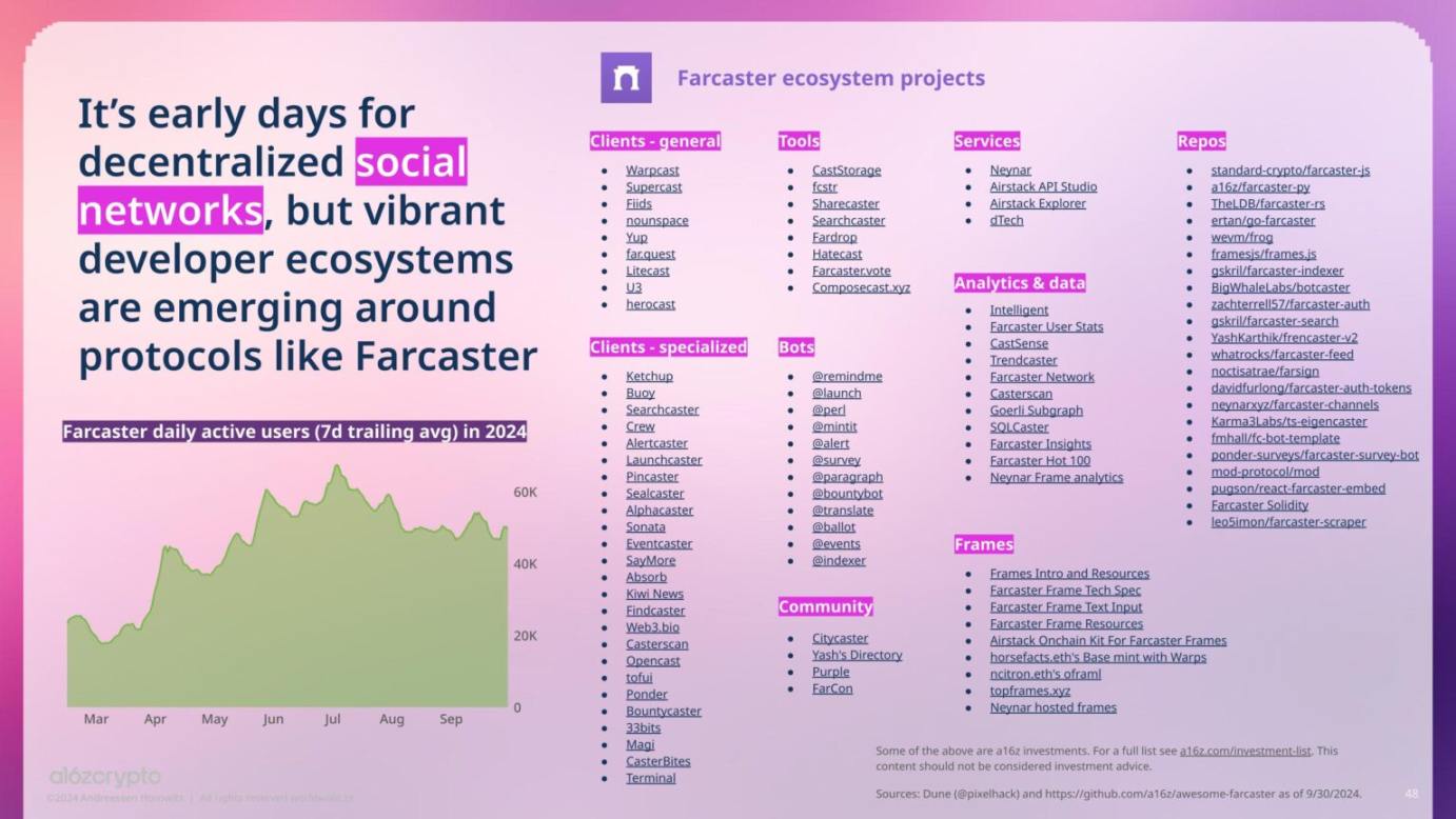 社交网络是另一例证。尽管目前仅占每日链上活动的一小部分,但吸引了强劲的构建活力:2024 年 10.3% 的加密项目与社交相关。事实上,与 Farcaster 相关的社交网络项目是今年前 5 大热门构建子类别之一。