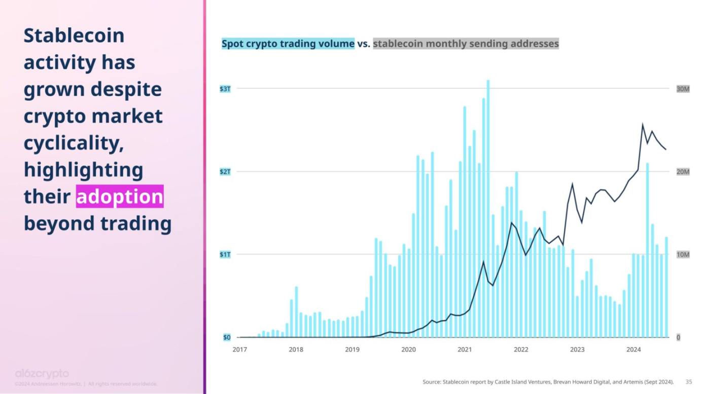 稳定币并非昙花一现。对比稳定币活动与加密货币波动市场周期,可见二者似乎无关。事实上即使现货加密货币交易量下降,月度稳定币的活跃地址数量仍在持续增长,这表明人们使用稳定币不仅是为了交易。