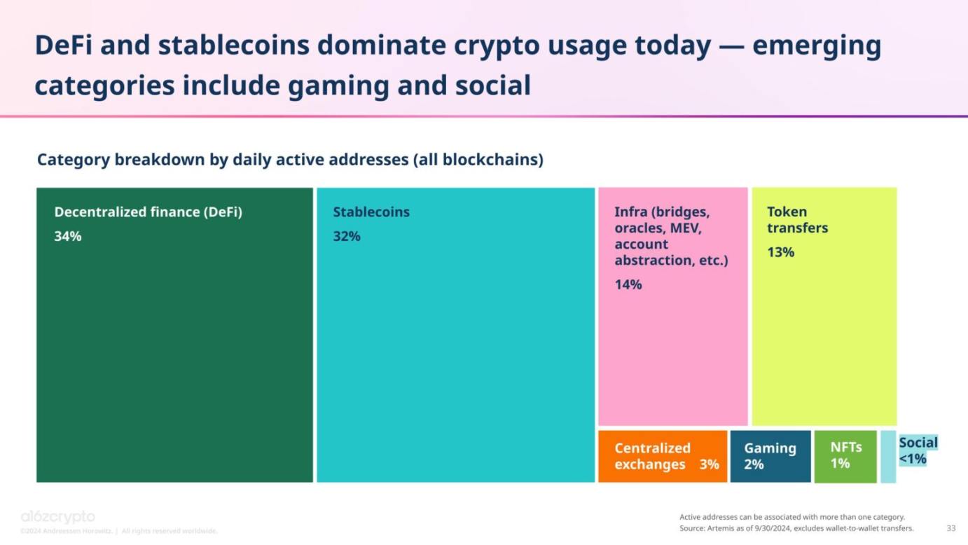 所有活动均体现在使用统计中。按每日活跃地址份额计算,稳定币占每日加密货币使用量的近三分之一(32%),仅次于去中心化金融(34%)。其余使用量分散在基础设施、代币转移及其他领域。