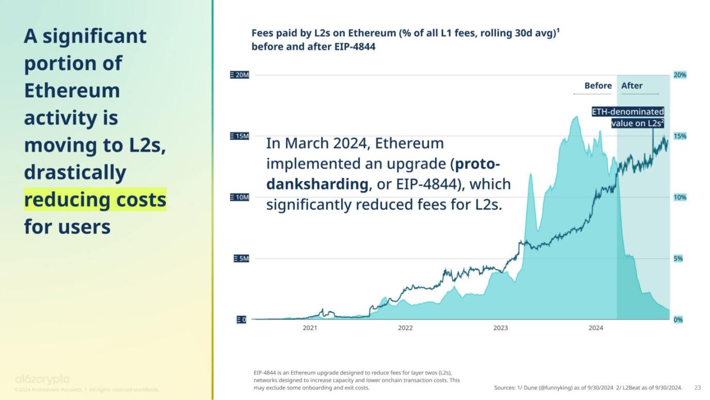 更显著的是以太坊今年最重要的升级"Dencun"(EIP-4844)于 2024 年 3 月实施后,显著降低了 L2 网络费用。此后,L2 在以太坊上支付的费用急剧下降,而 L2 上以 ETH 计价的价值却持续上升。这意味着区块链网络正变得更受欢迎、更高效。