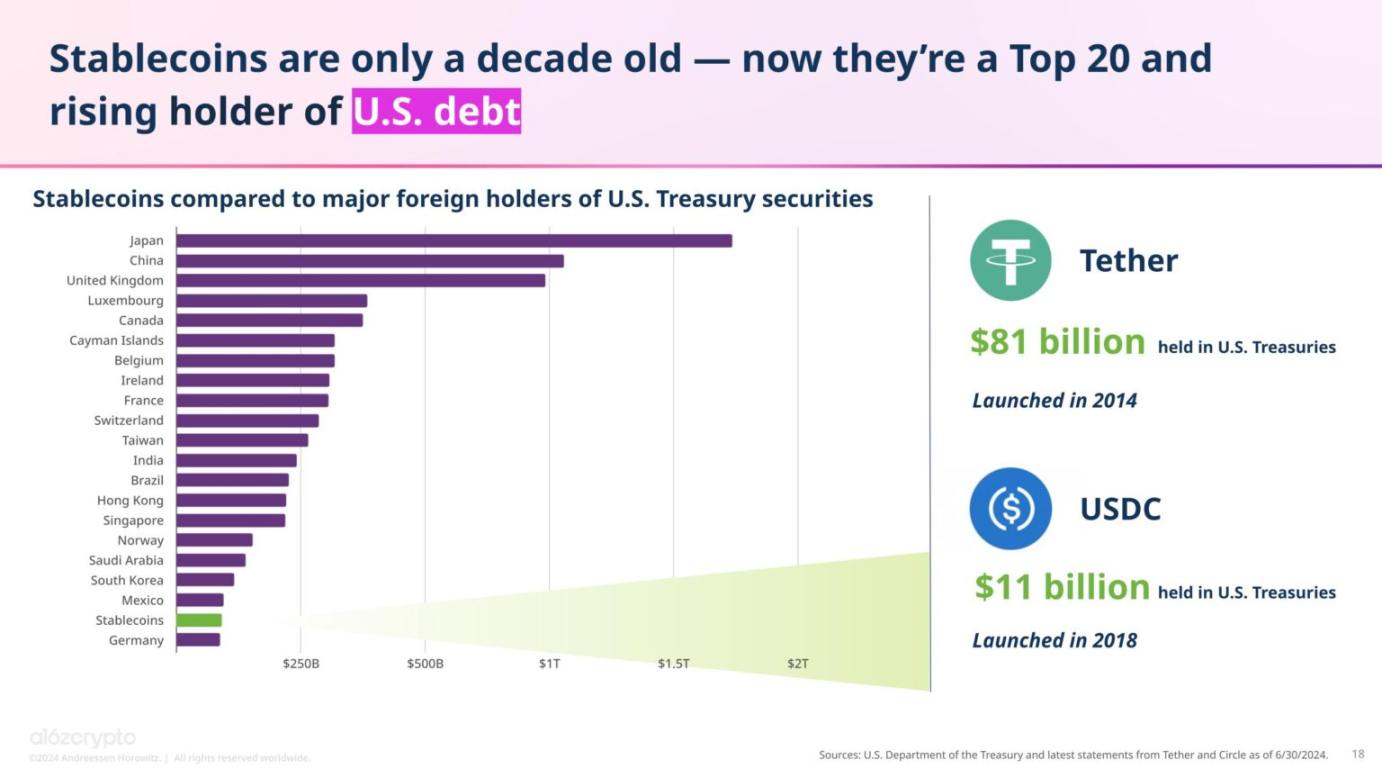 除了在全球范围内彰显美元实力,稳定币也可能加强美国国内金融基础。尽管仅有十年历史,稳定币已跻身美国债务前 20 大持有者之列,超过德国等国家。