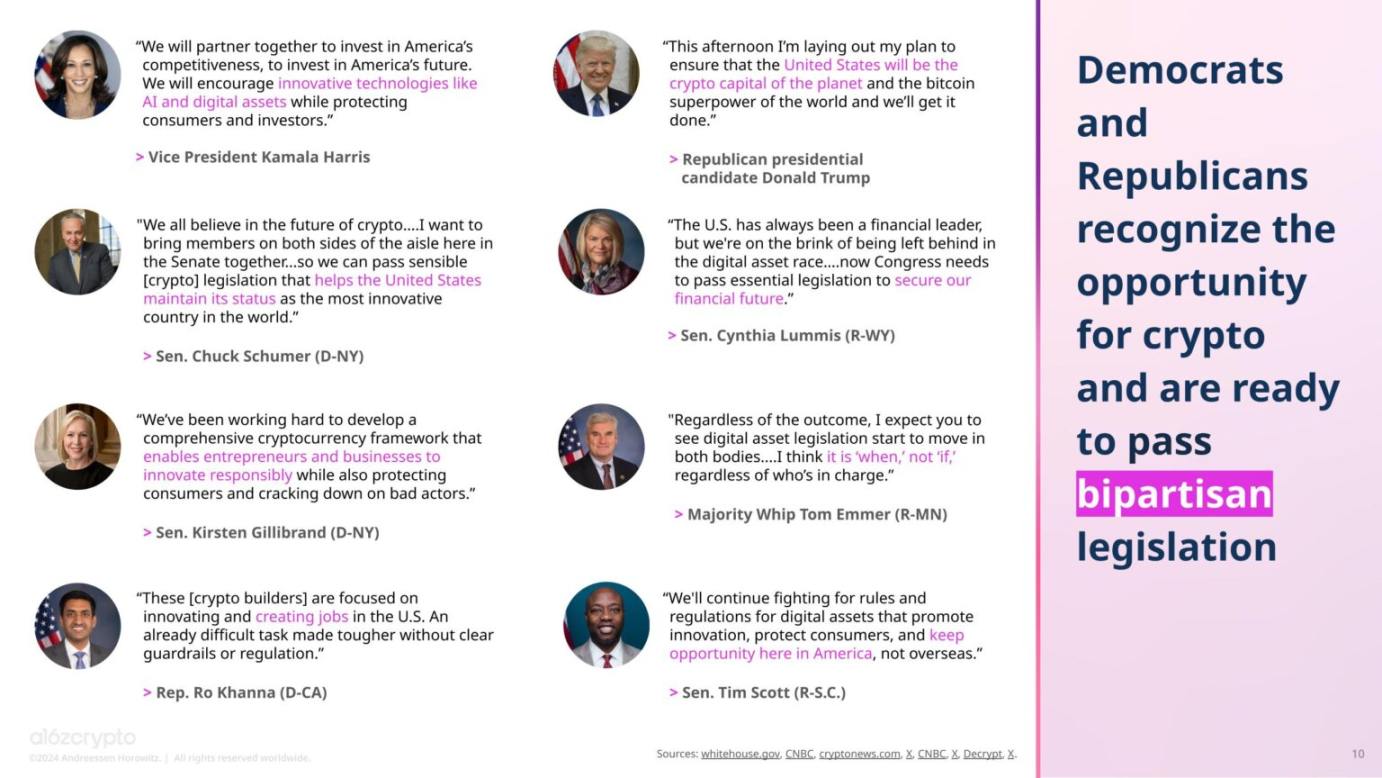 SEC 对 ETP 的批准是加密货币政策的重大里程碑。无论 11 月哪个政党胜出,许多政界人士预期随着两党加密货币立法的通过,相关势头将增强。两党中越来越多的政策制定者和政治家对加密货币发表积极看法。