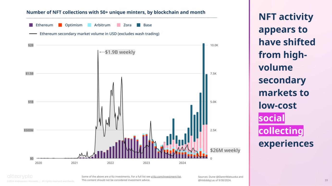 例如 NFT,几年前交易成本高昂时,NFT 二级市场交易额巨大。此后该活动消退,取而代之的是在 Zora、Rodeo 等社交应用上铸造低成本 NFT 合集的新消费行为。这代表了 NFT 市场的重大转变,在交易费用大幅降低前难以想象。