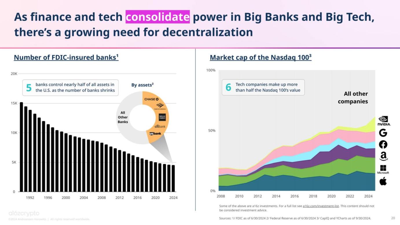 尽管处于早期阶段,DeFi 为美国金融体系日益中心化和权力集中的趋势提供了新替代方案。自 1990 年以来,美国金融体系的银行数量减少了三分之二,大银行在资产中所占的份额也越来越小。