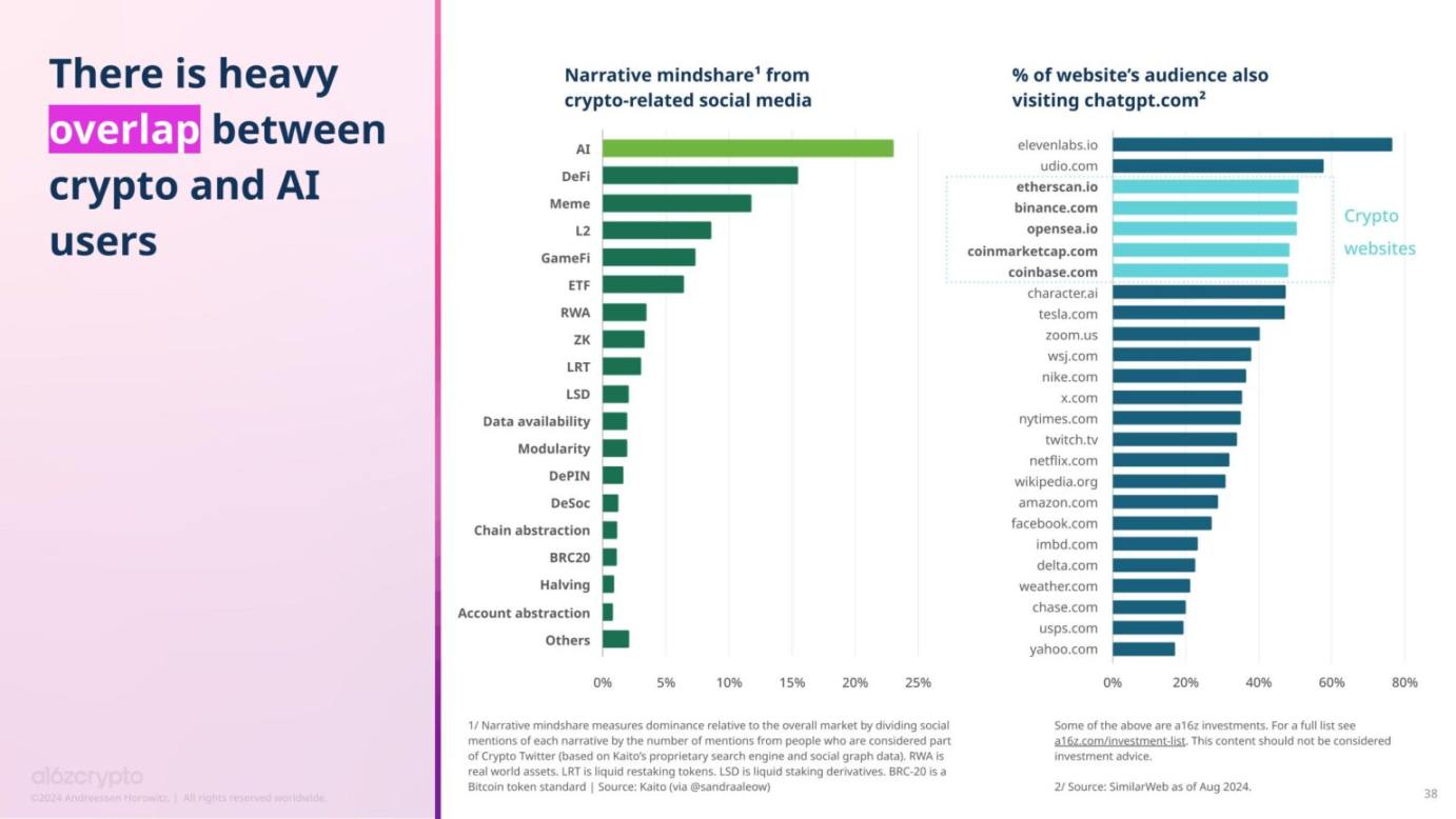 AI 是加密货币领域社交媒体影响者讨论最多的趋势之一。更令人惊讶的是,chatgpt.com 访问者与顶级加密货币网站访问者高度重合,表明加密用户与 AI 用户联系紧密。