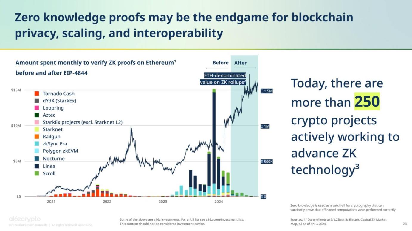 零知识证明技术的情况类似。尽管每月在以太坊上验证 ZK 证明的支出下降,但 ZK rollup 上以 ETH 计价的价值却增加。表明 ZK 证明在更受欢迎的同时,成本也在降低。