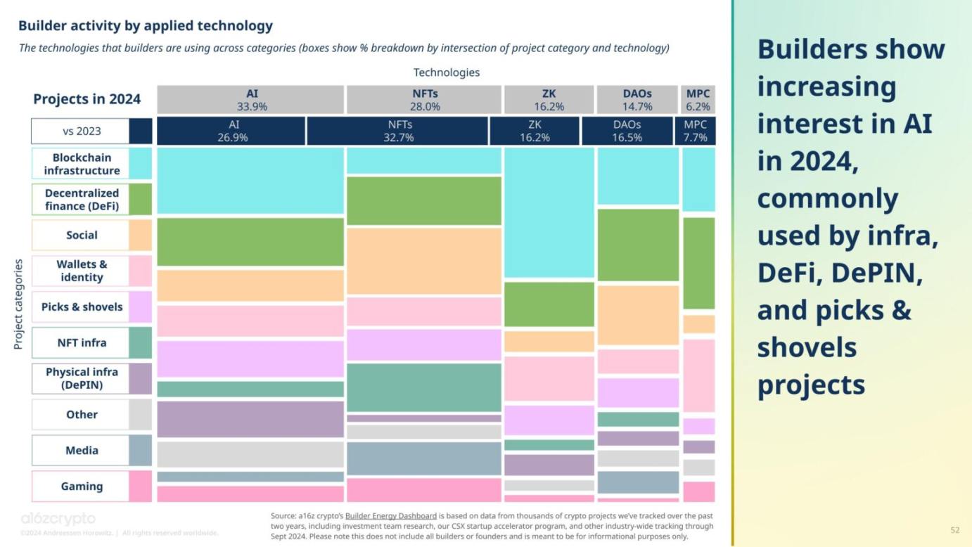 加密货币构建者与 AI 关联密切。根据构建者活力仪表板,约 34% 的加密项目表示正在使用 AI,高于一年前的 27%。应用 AI 技术最受欢迎的类别是区块链基础设施项目。