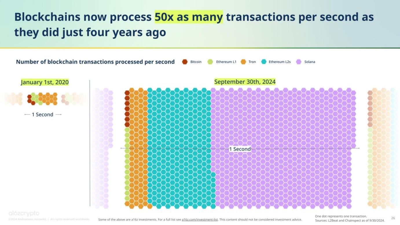 稳定币如此流行和易用,底层基础设施的进步是原因之一。首先区块链容量持续增长。得益于以太坊 L2 网络及其他高吞吐量区块链的兴起,当前区块链每秒处理交易量是四年前的 50 多倍。