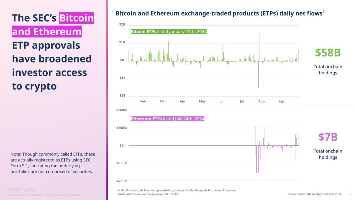 今年可能提升民众加密货币兴趣的因素是比特币和以太坊交易所交易产品的上市。随着此类 ETP 为投资者拓宽渠道,持有加密货币的美国人数量可能增长。比特币和以太坊 ETP 合计已持有 650 亿美元的链上资产。(注:虽然通常被称为 ETF,但这些产品实际使用 SEC S-1 表格注册为 ETP,表明其基础投资组合不包含证券。)
