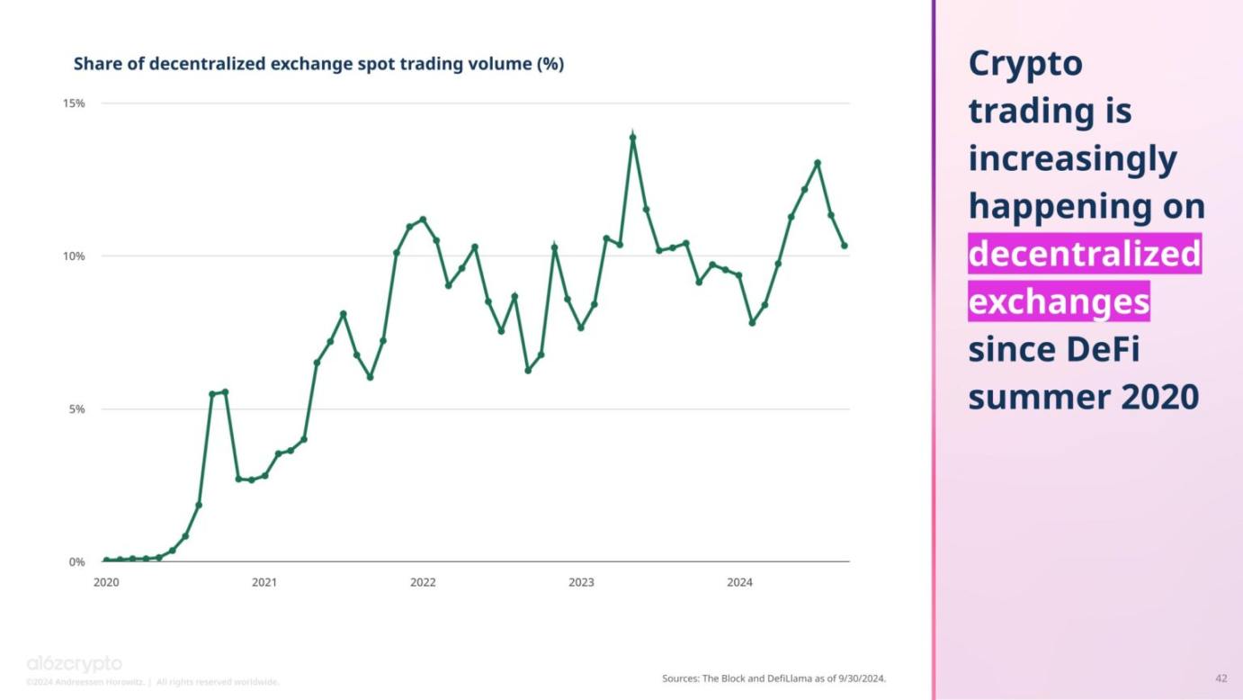 DeFi 是唯一比区块链基础设施更吸引构建者的类别(其也占每日加密货币使用量的 34%)。自 2020 年夏季 DeFi 兴起以来,去中心化交易所已占现货加密货币交易活动的 10%(而四年前这些交易完全发生在中心化交易所)。