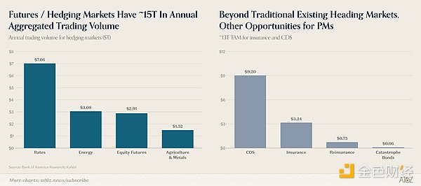 事实上,尽管预测市场目前规模尚小,但对冲市场本身体量极其庞大: