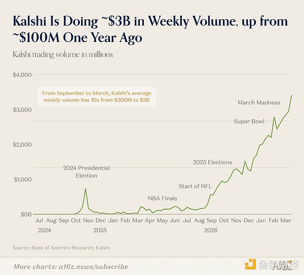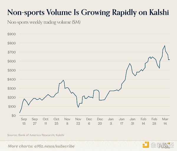 不过,尽管早期观点普遍认为预测市场仅在选举周期具备生命力,但 Kalshi 已在其他领域实现了显著增长。