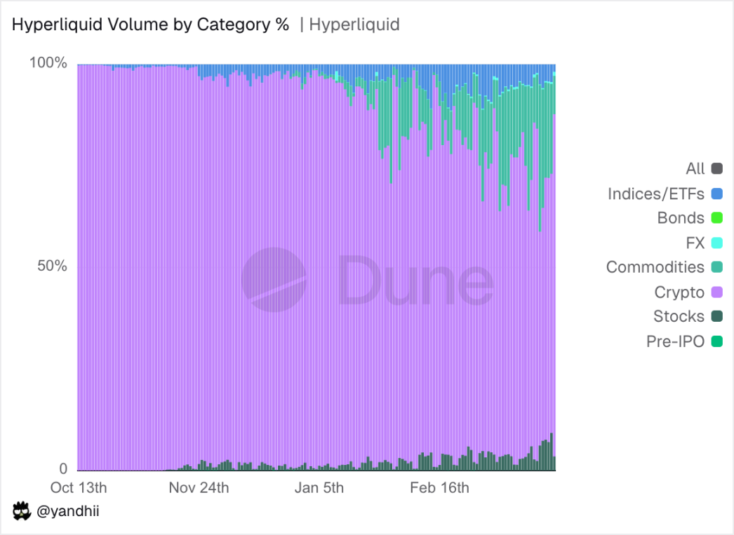 今年,RWA 永续合约的增长进一步加速。近几周,RWA 一度占到 Hyperliquid 总交易量的 44%,并持续成为平台手续费收入最高的交易对。