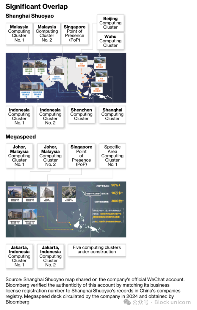 文章中发生的事情越来越奇怪,一家名为」上海硕曜「的中国公司拥有与 Megaspeed 几乎完全相同的网站和投资者介绍材料(如前所述),而且几个」正在建设中的计算集群「实际上都位于中国。