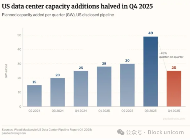 上周,经济学家 Paul Kedrosky 发表了一篇精彩的文章,文章的核心是一张图表,该图表显示,到 2025 年第四季度,新增数据中心容量(指在建容量,而非已投入使用的容量)将减少一半(数据来自 Wood Mackenzie):