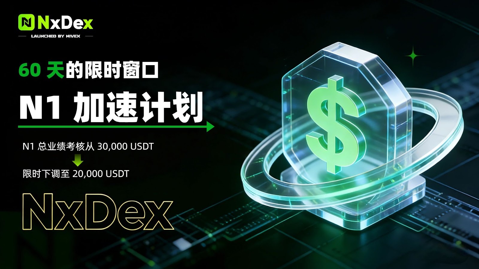 NxDex 现已正式起航。目前正在推行的 N1 加速计划更是为早期建设者提供了 60 天的限时窗口:总业绩考核从 30,000 USDT 限时下调至 20,000 USDT,协助核心用户快速完成初始占位。