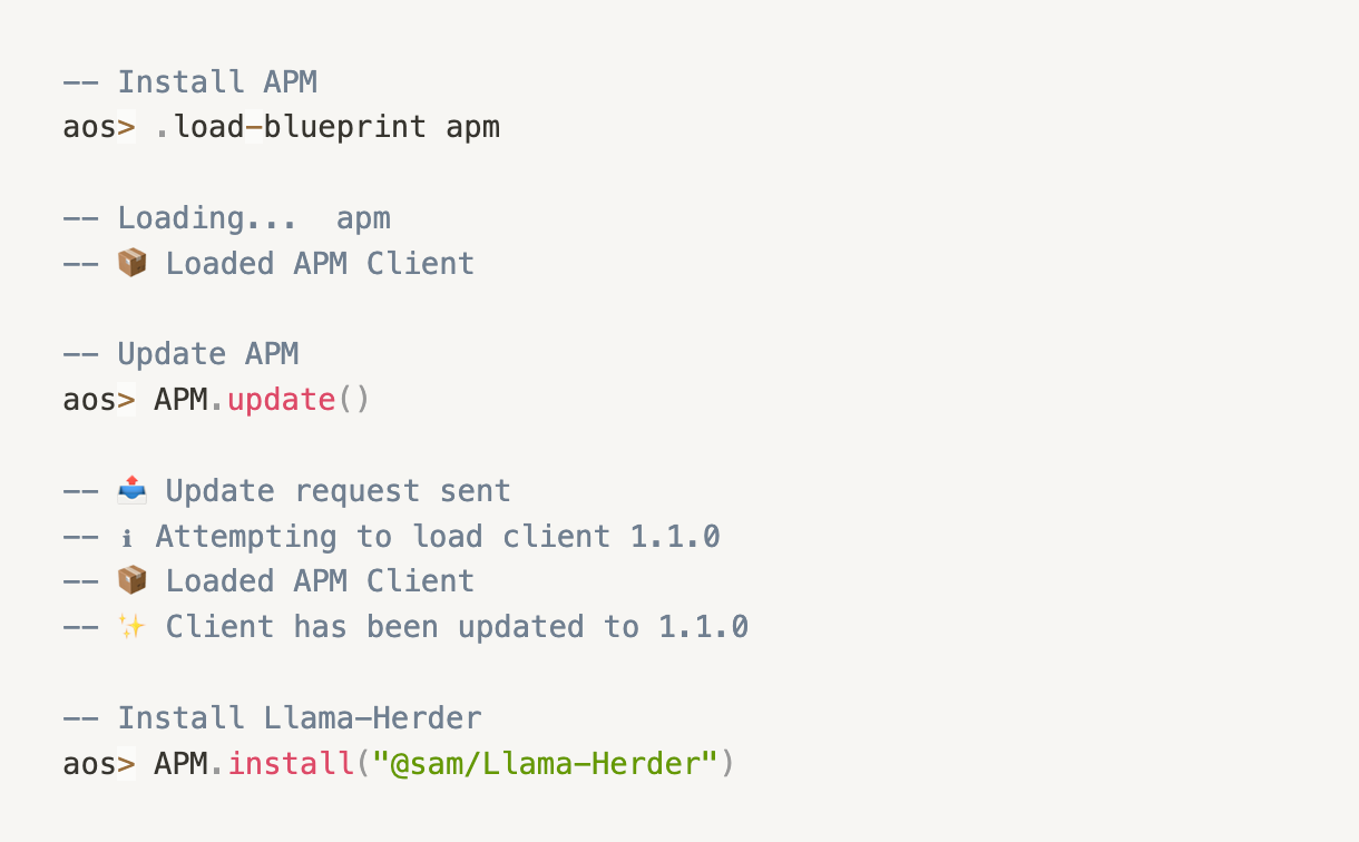 APM,全称是 AO package management。很多扩展包可以通过 apm 进行加载,就比如加载最近 AO 上大火的大模型。如下代码所示,