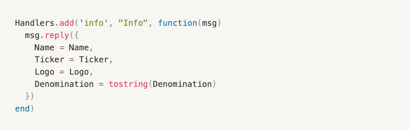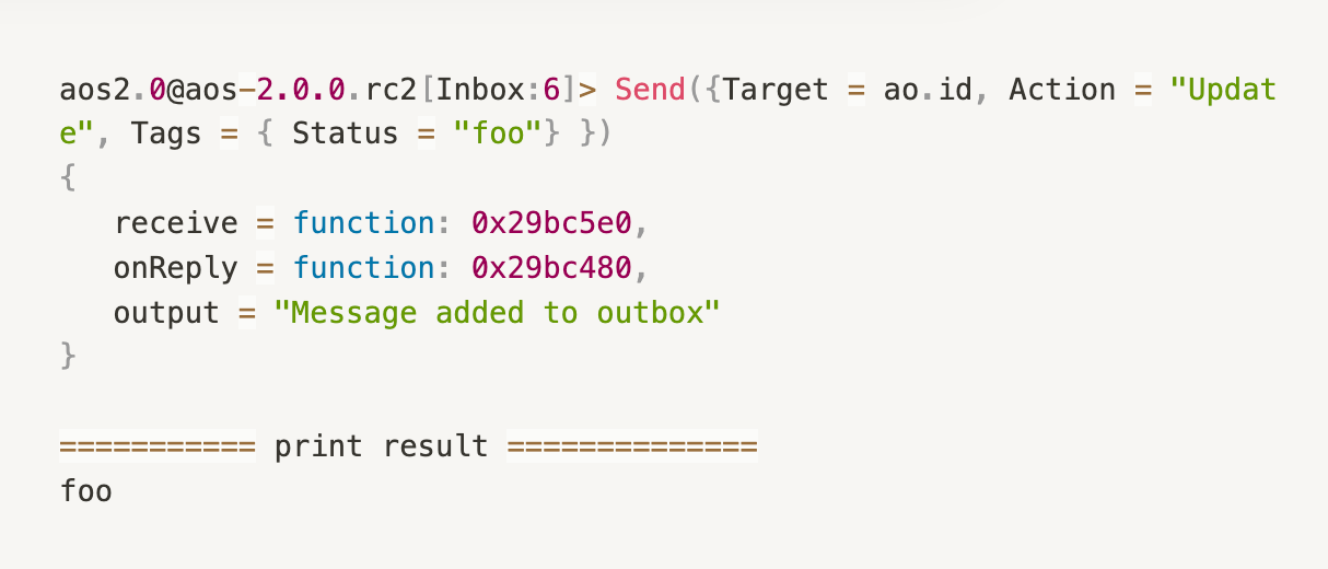 reply 方法则简单很多,更像是一个语法糖。上面的例子是 blue-print 中 token.lua 根据 aos 2.0 进行的改造。原来 msg.reply 是一个 ao.send 方法,但是在参数列表中少了 Target 这个参数。相当于开发者可以不用再关系 msg 的发送者,reply 函数会自动找到应该回复消息的进程。