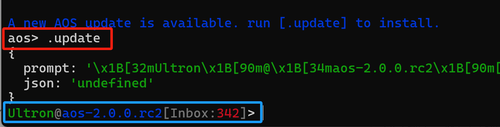 如果是过去已经创建的进程,那么需要在更新本地的 aos 到 2.0 以后,再连接上进程后,运行.update命令。如下图,升级完成后,aos 给出的 prompt 有如下变化,就是升级成功了。