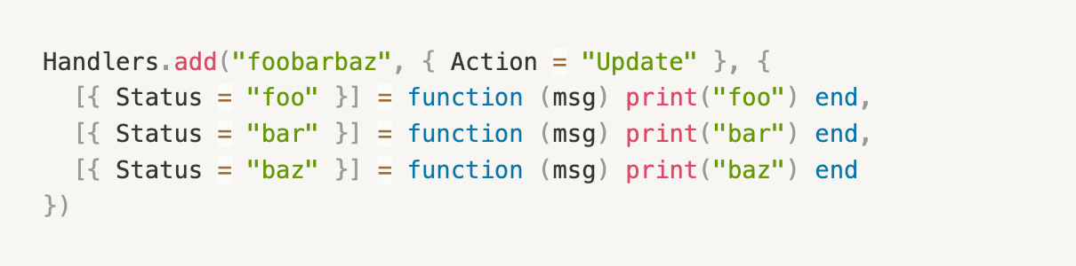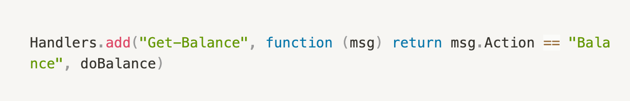 即 function (msg) return msg.Action == "Balance" 是判断收到的消息是否匹配当前 Handler。在 aos 2.0 之后的 pattern 就更加的灵活,由于前面提到过 Receive(pattern) 中的 pattern。因此,此处就不再赘述。