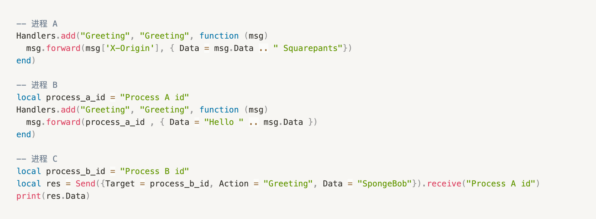 PS:对于旧的进程是无法进行这样的操作的。原因是 receive() 方法中是根据 Reference 这个 Tag 去查找返回的消息是否为需要回复接收的消息。而在之前旧的进程中,并没有 Reference 这个 Tag。但是 Receive(pattern) 依旧可以用的,需要自己构建 pattern 过滤出下一条消息为自己需要处理的消息。但是笔者建议,最好都升级下进程的 aos 版本。
