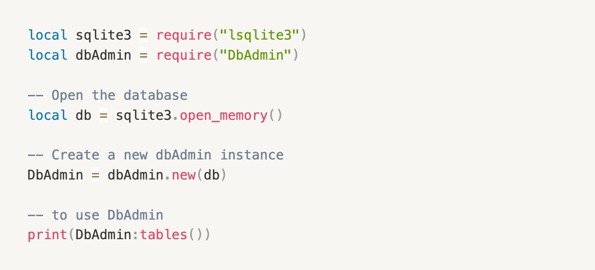 DbAdmin 是 aos 的核心开发者提供的一个操作 sqlite 的工具类。直接通过 .load 加载该文件会出现内存溢出的错误。正确的引入方法如下,需要先下载 DbAdmin.lua 的代码,放在自己的项目工程中。然后在需要操作 sqlite 的文件中 require("DbAdmin")。
