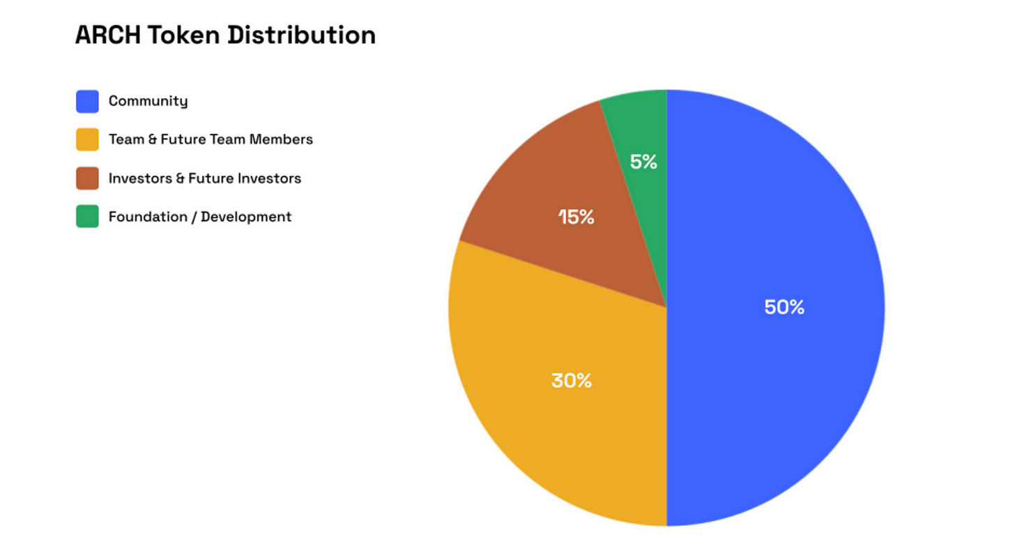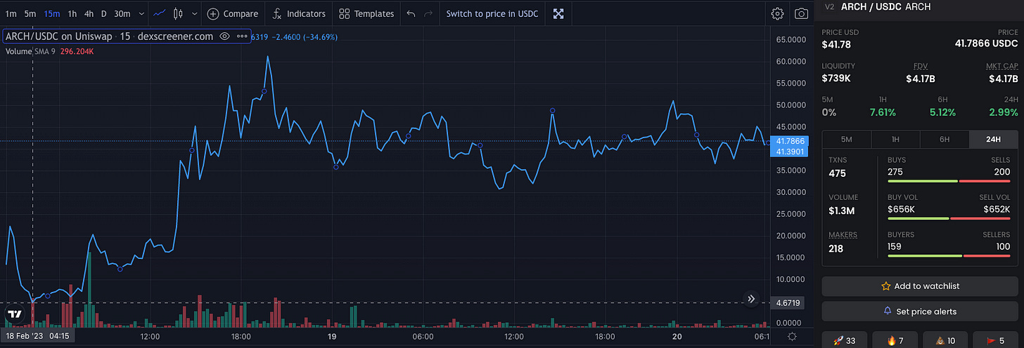 - ARCH总量为100M,目前报价$41,FDV高达4.17B,但其99%以上的代币都在锁定中,流动量不到1%,是一个典型的高FDV低流通盘的代币模型。其币价总最低点的$4.6左右至今2天的时间完成接近10倍的涨幅。伴随着未来的代币释放,ARCH的价格可能出现剧烈的波动。