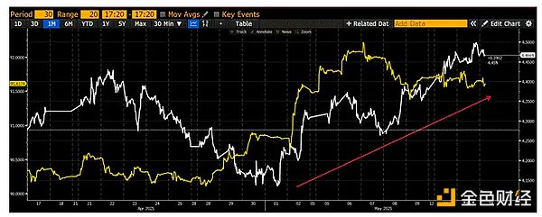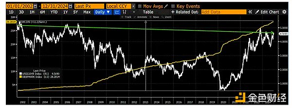彭博亚洲美元指数(金色)对比美国10年期国债收益率(白色)。当美元指数上涨时,亚洲本币走强,我们会看到10年期国债收益率相应走高。