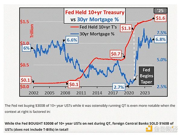 美联储正在缩减资产负债表。然而,美联储有权决定如何缩减,尤其是考虑到政策授权是净缩减,而不是所有期限的均匀缩减。耶伦和现在的贝森特需要为政府巨额的“臭屎债”提供资金。外国投资者和美国私营部门热衷于购买国债,因为它们是短期债券,而且有收益。这意味着它们是高收益的现金替代品,比低收益的银行存款更可取。但没有人想要长期国债,也就是10年期及以上的国债。美联储为了帮助耶伦和现在的贝森特为政府提供资金,通过实施10年期国债量化宽松政策,帮了他们两个大忙。鲍威尔一边说政府赤字是个问题,一边又继续通过允许收益率保持在政治上可接受的低水平来容纳上述支出,这非常不诚实,因为美联储开动印钞机压低了10年期国债收益率。