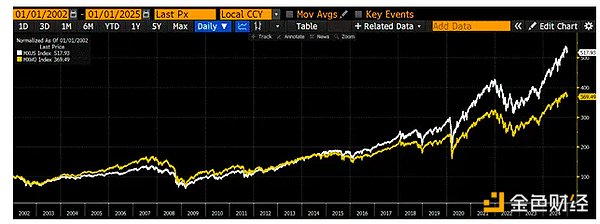 自 2022 年以来,MSCI 美国指数(白色)的表现比 MSCI 全球指数(金色)高出 148%:美国股市例外论。