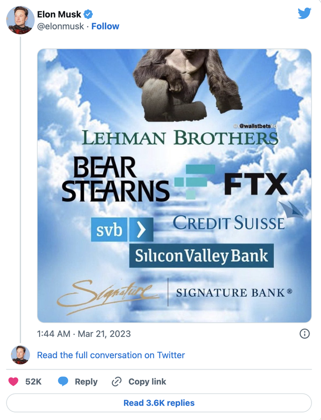 亿万富翁马斯克在市场恐慌中分享了他对银行危机和银行失败的看法。