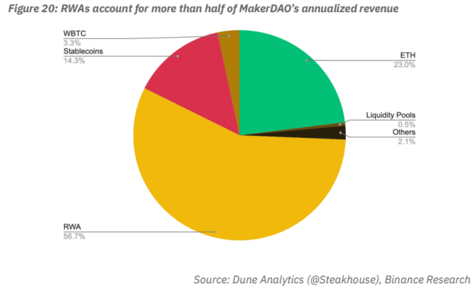 今天,MakerDAO 的 RWA 金库价值超过 6.8 亿美元。这意味着,通过 RWA 支持的贷款,MakerDAO 已经能够将发行到市场的 DAI 数量扩大。此外,这意味着有超过 6.8 亿美元的 RWA 帮助维持 MakerDAO 的 1 美元挂钩稳定性。