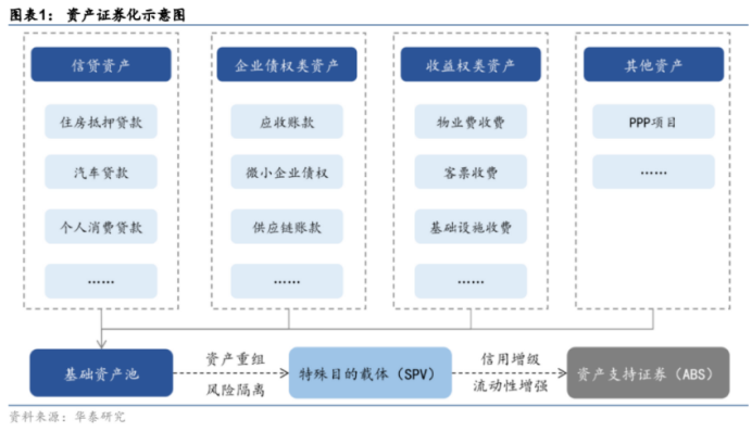 资产证券化(Asset-backed Security, ABS)指原始权益人将预期能产生现金流的基础资产通过结构化等方式加以组合,使其能够在市场上发行和交易的融资手段。