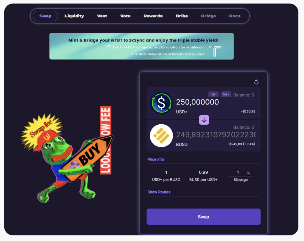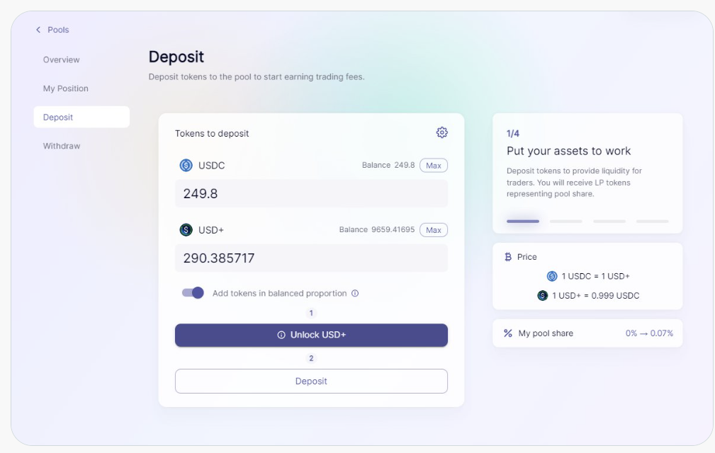 如果你只想获取交易量,只兑换少量,将剩下的部分保留待以后从 usd+ 再次大额兑换到usdc(报价会损失一些美元,但对于交易量来说可能是值得的。将 10,000 美元的 usdc 通过 usd+ 到 usdc 的兑换最终可能会亏损 8 美元,但对于交易量来说可能是值得的。只要确保看起来相对自然即可)。
