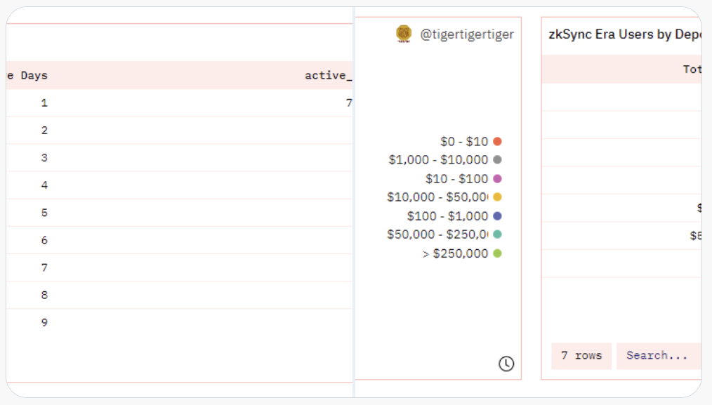按照本指南,您将与 10 个以上的智能合约进行交互,并执行超过 25 个交易。如果我们查看其他 zkSync 用户的活动 https://dune.com/tigertigertiger/zksync-airdrop-criteria,我们可以看到大多数“用户”进行的兑换次数较少,交易量也较少,因此您有很高的资格获得空投资格。