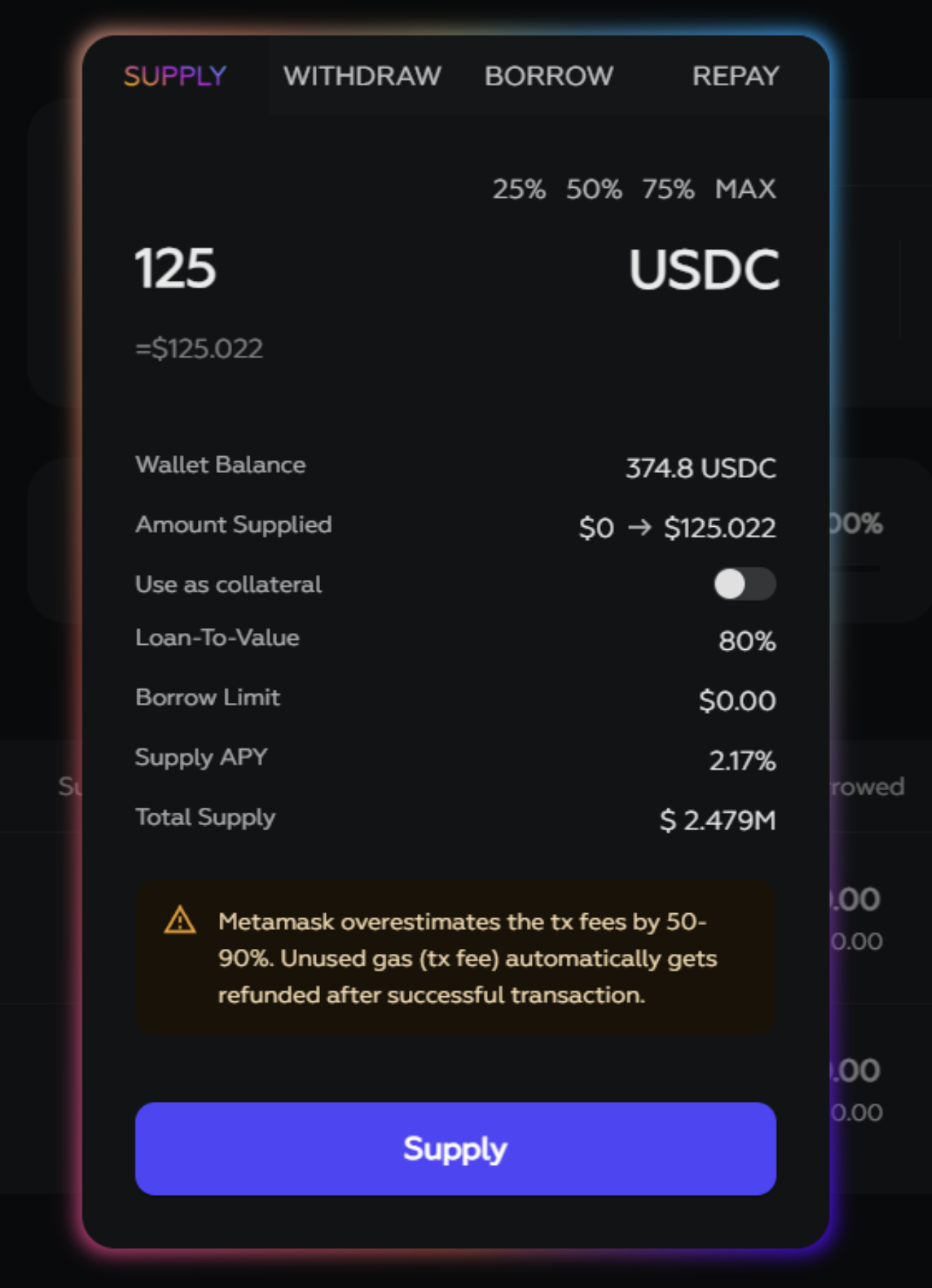 6、将 $usdc 供应到 @Era_Lend 和 @ReactorFusionR。